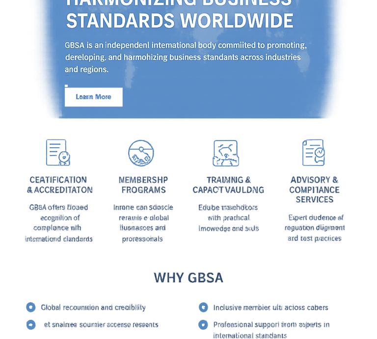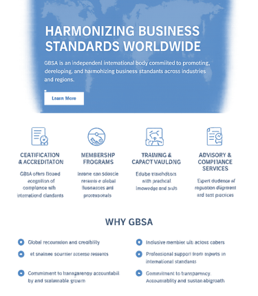 The Global Business Standards Authority (GBSA) is an independent international body committed to promoting, developing, and harmonizing business standards across industries and regions. We provide certification, accreditation, and compliance frameworks that empower businesses and institutions to operate with credibility, transparency, and with global recognition.